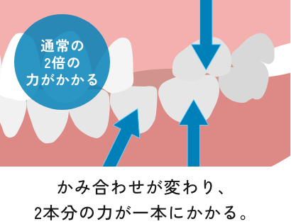 理想の歯の状態は、上下で1本1本がかみ合っている状態です。1本歯を失うとかみ合わせが変わり、残った歯に2本分の力がかかるようになっていきます。